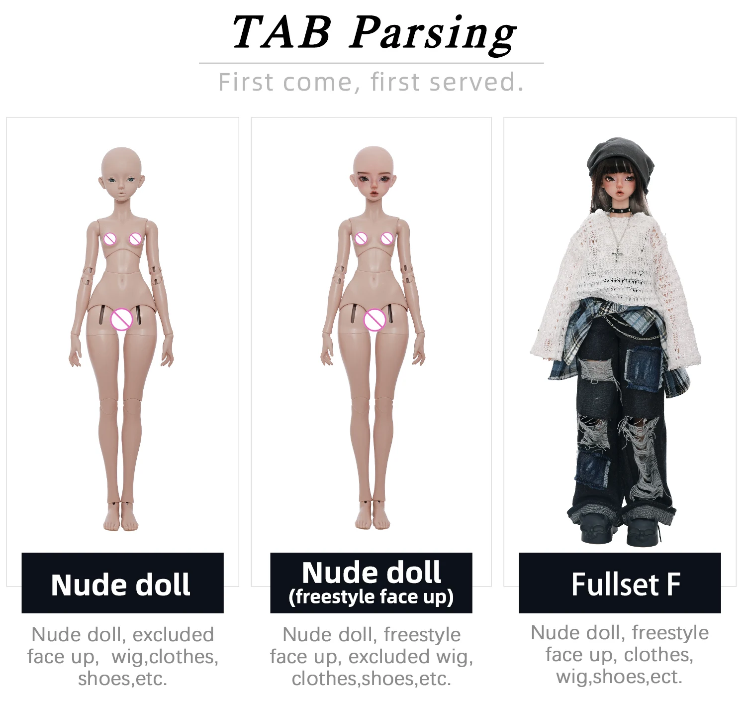 3. Fullset: Nude doll, Freestyle face up, clothes, wig, shoes etc.