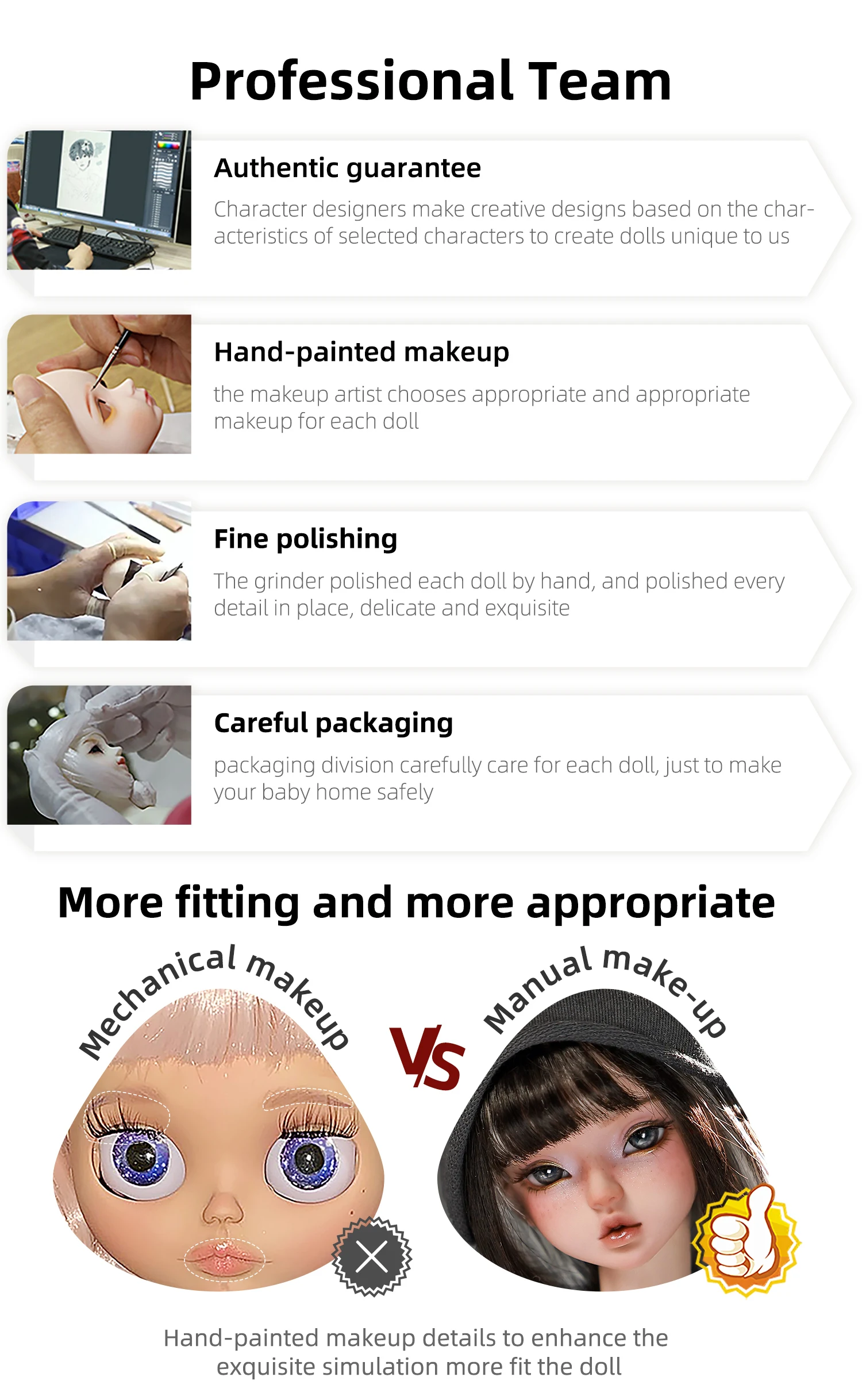 1. Strength team: focusing on BJD doll for more than 10 years, integrating r&d, design, production and sales; Owns the original senior painter, modelers, dresser, make-up artist, from the creation, design, to mold, molding, grinding, makeup, and then to apparel design and production of up to hundreds of working procedure, such as sewing, modelling all completed by experienced craftsmen, presented to your BJD doll each style is unique and highly aesthetic value of art.