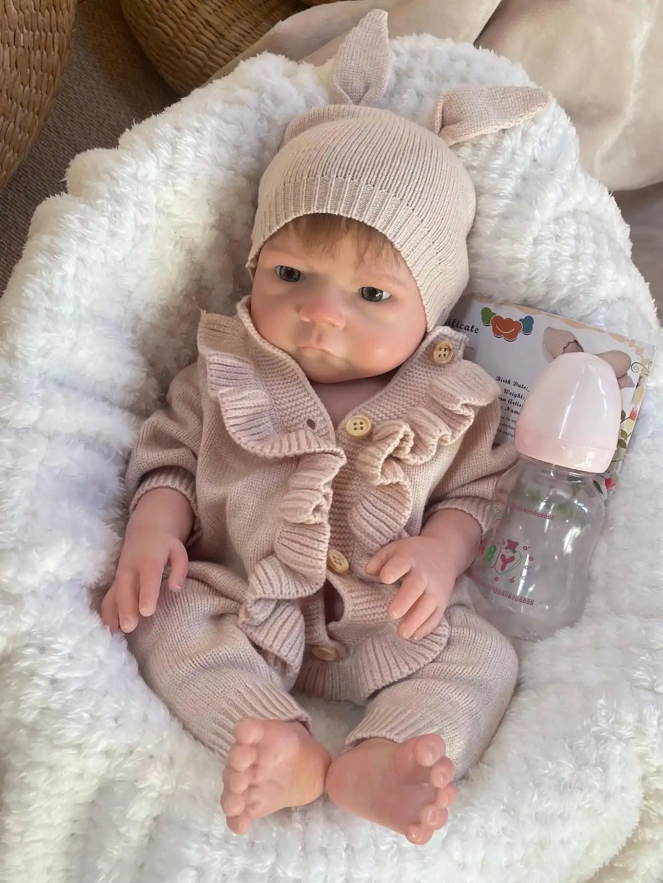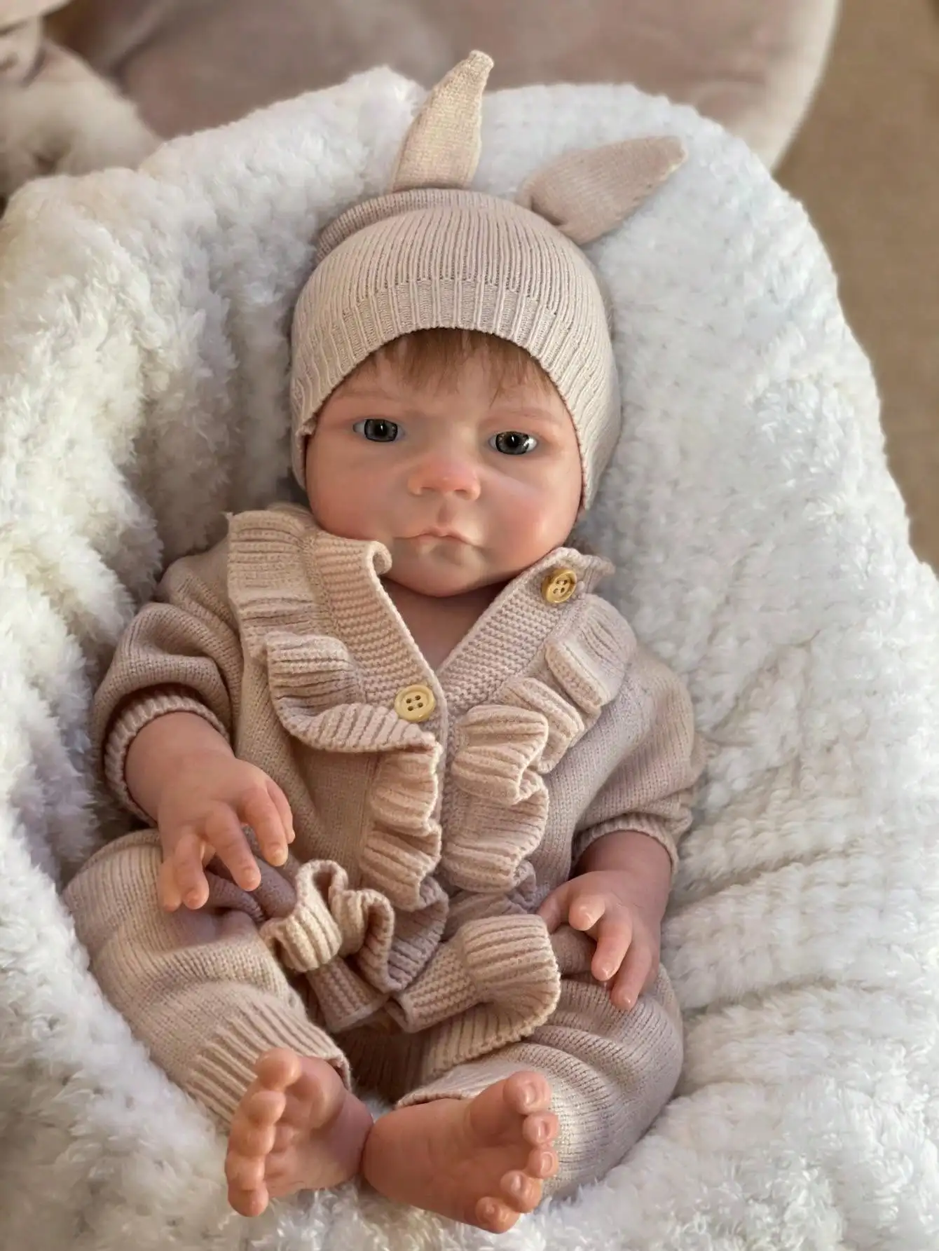 Saskia 18 Inch Solid Silicone Reborn Doll Handmade 3D Artist Painted Vivid Newborn Rooted Hair Girl With Rabbit Hat Collectible