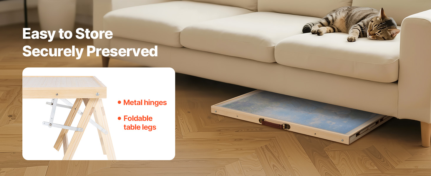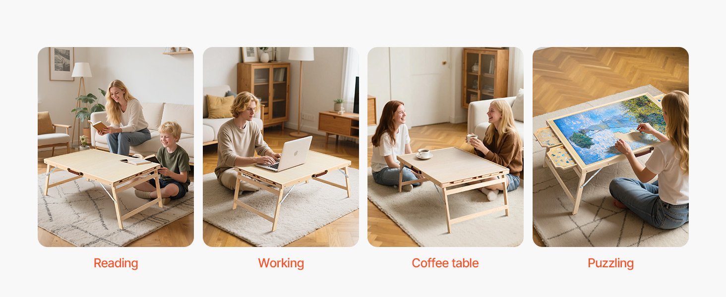 2-in-1 Function :The tabletop serves as a desk and is equipped with 4 metal hinges on the legs for easy folding. The large puzzle table can be used for studying, writing, eating, drawing, working, and can be stored under a sofa, bed, and dining chair